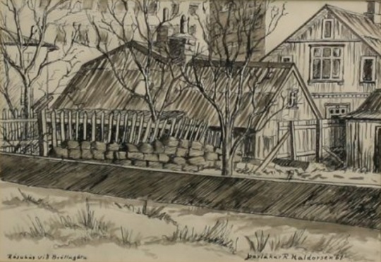 Teikning sem sýnir Reykjavík séð frá Hólavallatúni (milli Garðastrætis og Hávallagötu). Myndin sýnir Reykjavík nálægt árinu 1840. Örin hægra megin bendir á Grjótabæina, en örin vinstra megin á bæi sem stóðu norðar í Grjótaþorpi nær Vesturgötu. Lengst til vinstri má sjá Hlíðarhús með þremur burstum. Esjan sést í bakgrunni, talsvert ólík raunveruleikanum.