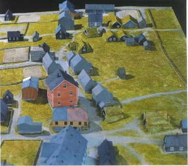 | Líkan af suðurhluta Grjótaþorps eins og talið er að það hafi litið út árið 1886. Stóra rauða timburhúsið er Vinaminni við Mjóstræti (áður Brekkustígur). Nokkrir torfbæir sjást á myndinni. Neðst hægra megin er Hákot, þar næst Arabær við Mjóstræti. Ofar á myndinni er Hákonarbær og þar fyrir ofan Grjóti, Vaktarabær og Helgabær. |