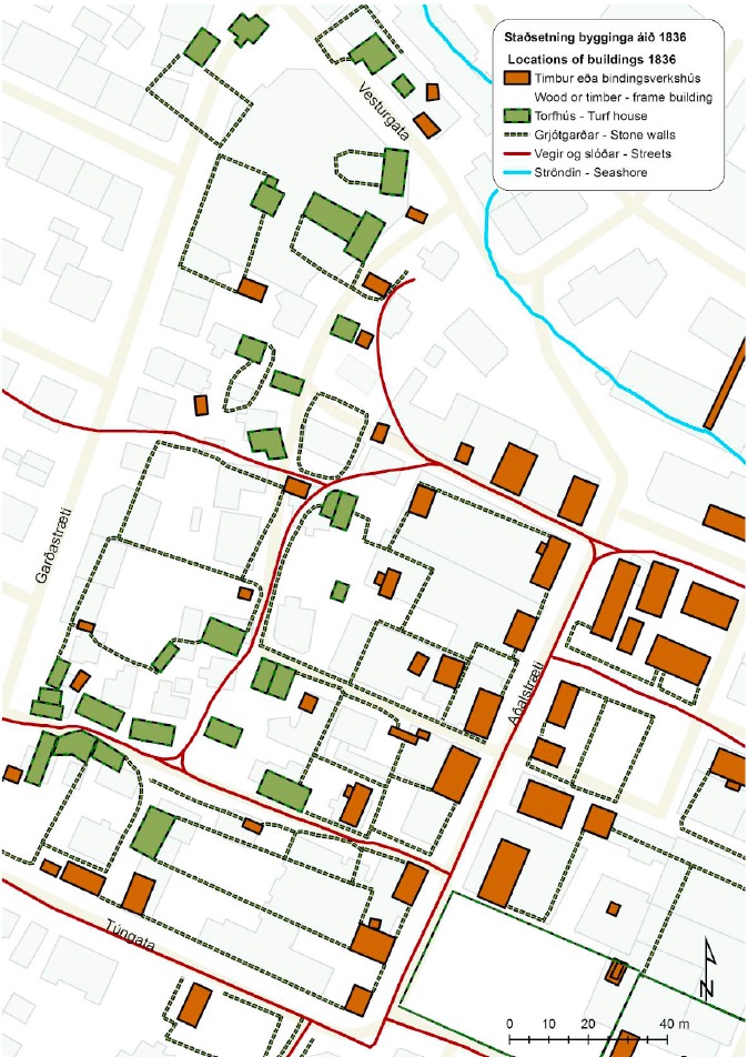 | Kort Lottin frá 1836 lagt yfir núverandi götukort. Torfbæirnir í Grjótaþorpi eru merktir grænir og gefur myndin því býsna góða mynd af staðsetningu torfbæjanna. |