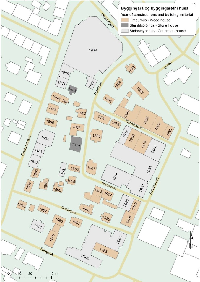 Myndin sýnir byggingarár þeirra húsa sem nú tilheyra Grjótaþorpi. |