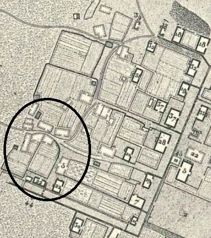 Norðar á myndinni má sjá nokkra torfbæi til viðbótar (ljósmerktir). Vigfúsarkot og í framhaldi Hóll (Hólkot) við Hlíðarhúsastíg (Vesturgötu). Norðan við Hlíðarhúsastíg gengt Hól er Helluland, sem þótti eitt alaumasta kotið í Reykjavík. Vestan megin við Hól eru bæirnir Gróubær og Dúkskot þar sem í dag er Garðastræti.