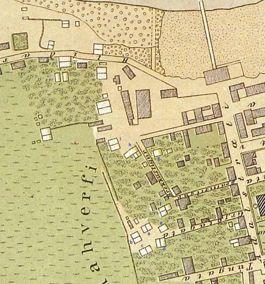 Kort Sveins Sveinssonar af Grjótaþorpi og næsta umhverfi frá 1876. Sjá má helstu götur eða götuslóða, sem enn í dag hafa að mestu sömu heiti og liggja eins. Búið er að merkja með bókstöfum torfbæi í suðurhluta Grjótaþorps sem eru Grjótabæirnir og bæir sem stóðu þar sem nú er Mjóstræti, en taldist þá hluti af Brekkustíg. Bæirnir eru: