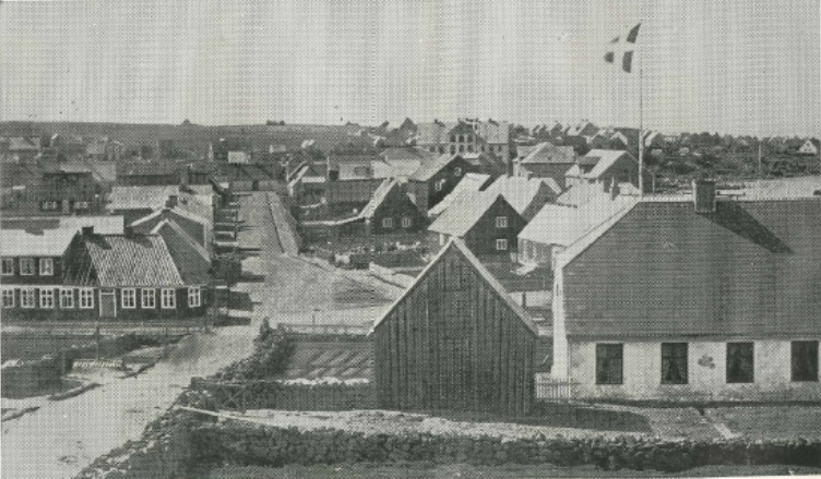 | Ljósmynd tekin árið 1877 af miðbænum og Grjótaþorpi í baksýn. Horft inn Austurstræti. Þótt myndin sé ekki skýr má greina bæi í Grjótaþorpi. |