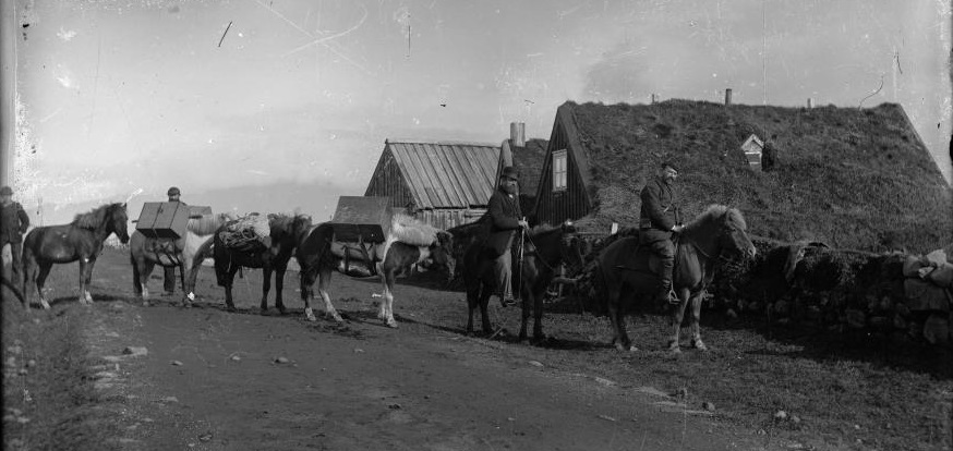 Væntanlega eru þetta hjónin Magnús Einarsson og Guðrún Klængsdóttir sem þarna standa við bæ sinn. Myndin virðist tekin úr risinu á Ráðherrabústaðnum. Ráðherrabústaðurinn var byggður árið 1908 og myndin því tekin á tímabilinu 1908 til 1916 þegar bærinn var rifinn. Ekki virðist sérstakur gleðisvipur á þeim hjónum, en strákunum fremst á myndinni finnst aðfarir ljósmyndarans augljóslega spennandi. |