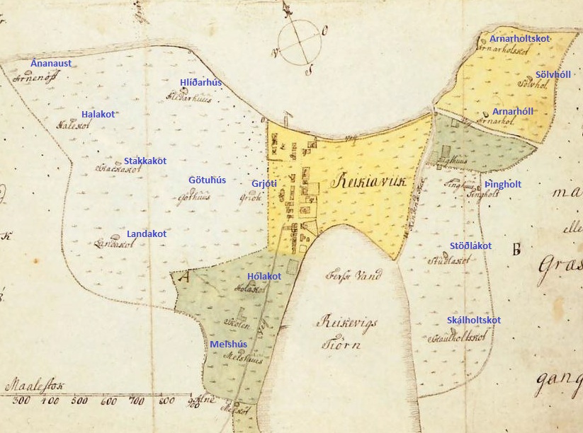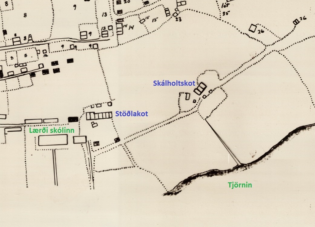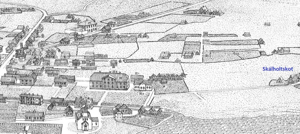Kort af suður Þingholtum frá árinu 1880. Skálholtskot er merkt inn á myndina sem og Stöðlakot, en bæði voru hjáleigur frá Reykjavíkurbænum, þær einu austan lækjar. Lærði skólinn og Bókhlaðan sjást einnig og stígurinn sem liggur upp að Stöðlakoti er í dag Bókhlöðustígur. Milli Stöðlakots og Skálholtskots lá einnig stígur eða troðningur sem var upphafið að Laufásvegi. Stígurinn lá síðan áfram að Laufási og þaðan að Grænuborg eins og Laufásvegur liggur í dag.