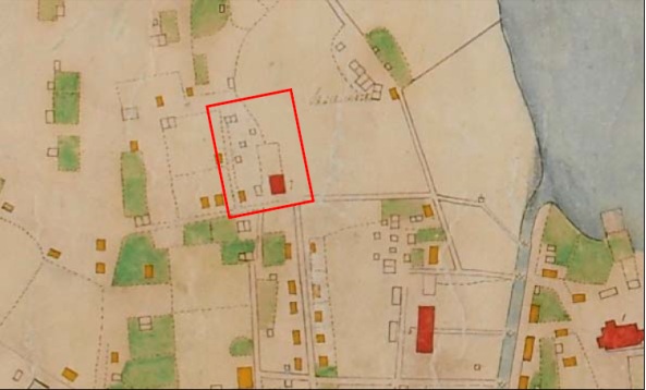 | Kort Niels Aage-Edwin eins og Þingholtin litu út árið 1876. Skálholtskot er lengst til hægri á myndinni. Stígurinn frá Bókhlöðu Menntaskólanum að Skálholtskoti er Laufásvegur í dag. Skálholtsstígur heitir eftir bænum. | Kort af Þingholtum árið 1887. Rauði kassinn sýnir hús við Þingholtsstræti. Skálholtskot er ofarlega hægra megin við rauða kassann. |