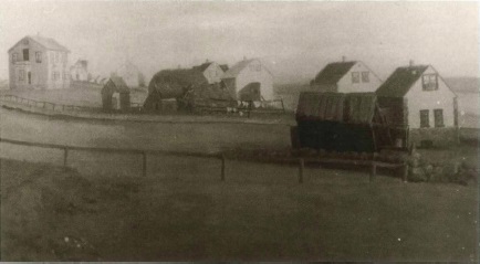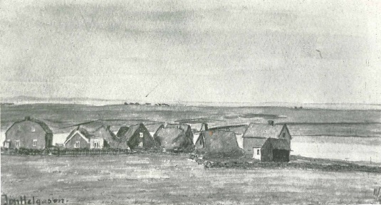 Málverk Jóns Helgasonar af Skálholtskoti frá 1895. Skálholtskot var á síðari hluta 19. aldar þyrping húsa, sum enn torfbæir.